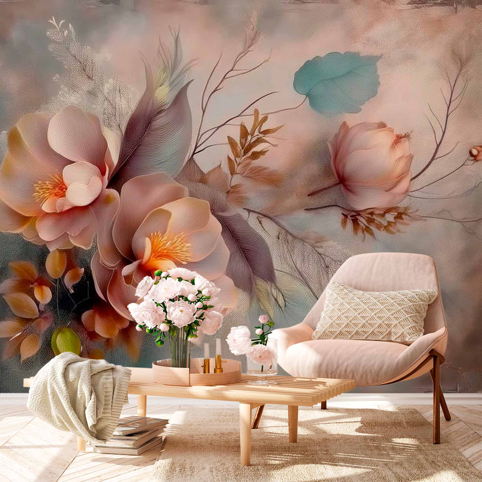 Obraz przedstawia delikatną, eteryczną tapetę z motywem kwiatowym, charakteryzującą się spokojną i uspokajającą atmosferą. Kwiaty są delikatnie pomalowane w ciepłych, pastelowych odcieniach brzoskwini, różu i beżu, z delikatnymi akcentami pomarańczy pośrodku. Płatki są cienkie i półprzezroczyste, sprawiają wrażenie, jakby unosiły się w sennej mgle. Tło stanowi mieszankę stonowanych tonów, tworząc mglisty efekt akwareli, który podkreśla ogólną miękkość projektu. Delikatne, delikatne gałęzie i liście w subtelnych odcieniach dodają delikatnej, pełnej wdzięku estetyki. Ta tapeta emanuje spokojem i wniesie spokojny, elegancki akcent do każdej przestrzeni.