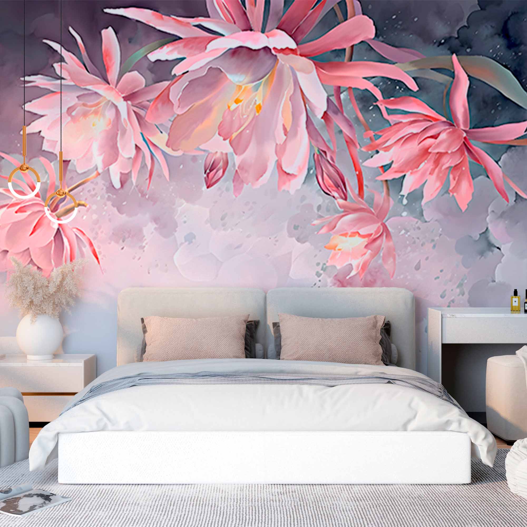 Zdjęcie przedstawia fototapetę przedstawiającą miękkie, różowe kwiaty w stylu akwareli w pełnym rozkwicie. Delikatne płatki i jasne pastelowe odcienie płynnie komponują się z mglistym, eterycznym tłem, tworząc marzycielską i uspokajającą atmosferę. Zastosowanie subtelnych gradientów i jasnych plam koloru nadaje fototapecie płynny, artystyczny charakter, dzięki czemu idealnie nadaje się do dodania romantycznego i eleganckiego akcentu każdemu wnętrzu. Połączenie delikatnych różów, zieleni i neutralnych odcieni dodaje mu delikatnego, pogodnego uroku.