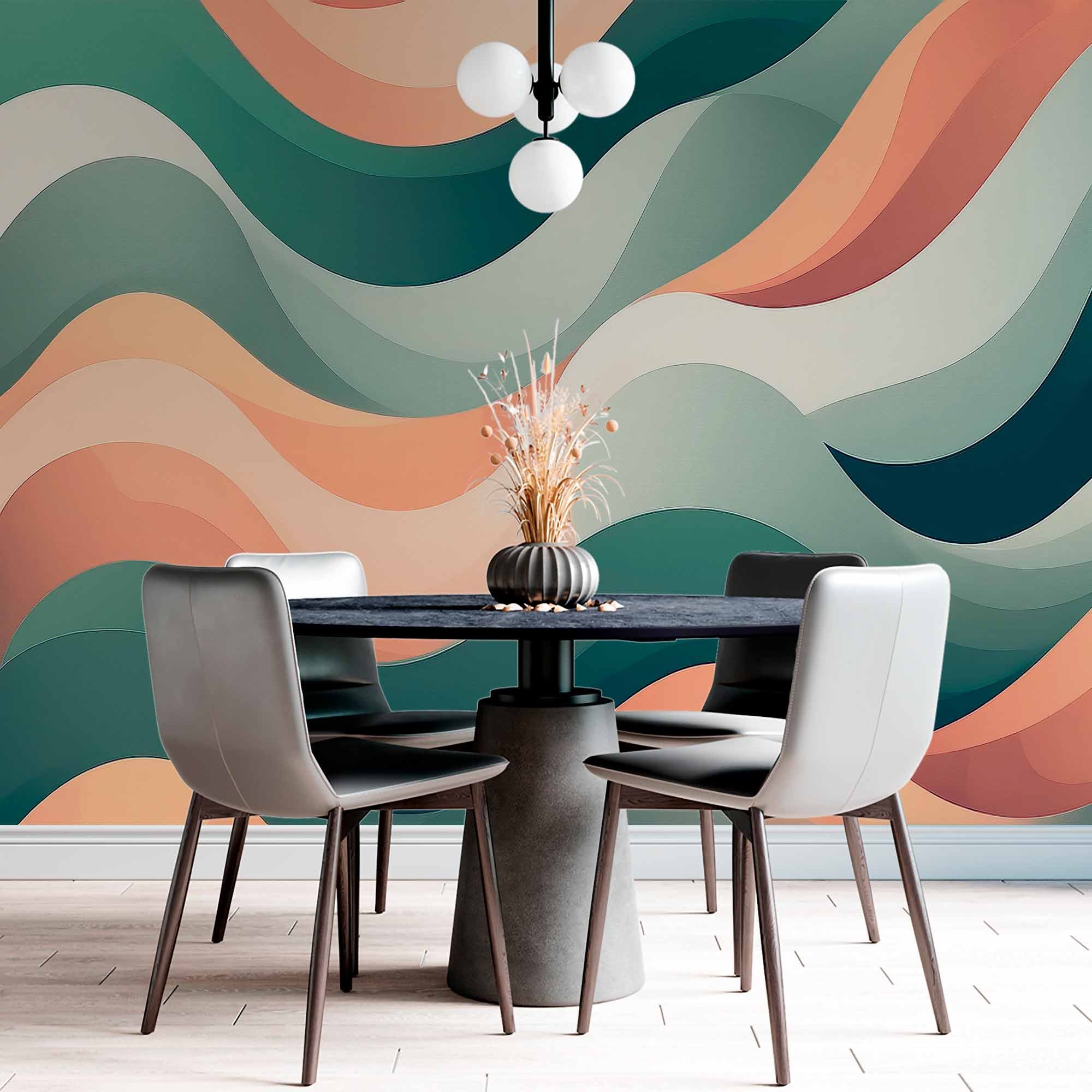 Każda fala składa się z kilku warstw, co nadaje obrazowi objętość i głębię. Odcienie brzoskwini i zieleni przeplatają się, tworząc przyjemny wizualny rytm. Kształt fal i ich paleta kolorów tworzą kojący i wyciszający nastrój, przypominający ruch wody i naturalne krajobrazy. Ogólnie obraz, pomimo swojej abstrakcyjności, budzi skojarzenia z naturą i morzem.