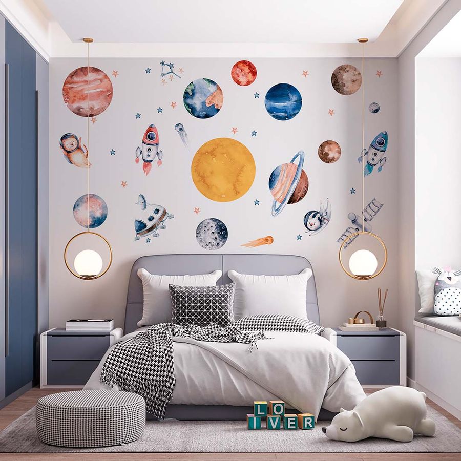 Wyrusz w międzygwiezdną podróż z naszą urzekającą kolekcją naklejek ściennych dla dzieci Układu Słonecznego. W zależności od ustawionego rozmiaru otrzymasz ponad 50 naklejek.