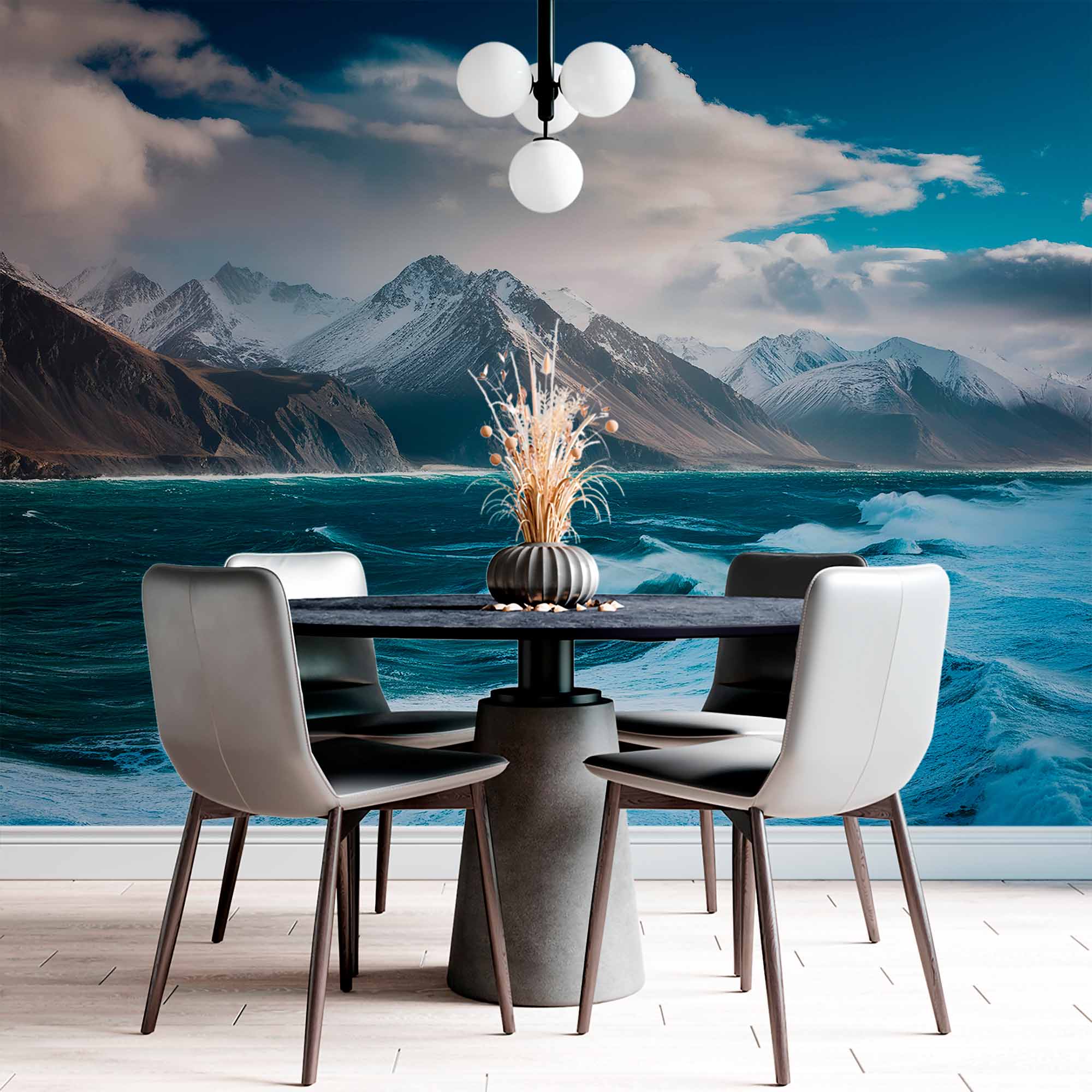 Zdjęcie przedstawia dramatyczny pejzaż morski, w którym potężne fale oceanu rozbijają się o nierówne wybrzeże z wysokimi, ośnieżonymi górami w tle. Niebo powyżej jest częściowo zachmurzone, co dodaje scenie majestatycznej i dzikiej atmosfery. Kontrast pomiędzy ciemnymi, wzburzonymi wodami a spokojnymi, pokrytymi śniegiem szczytami tworzy uderzający i urzekający obraz