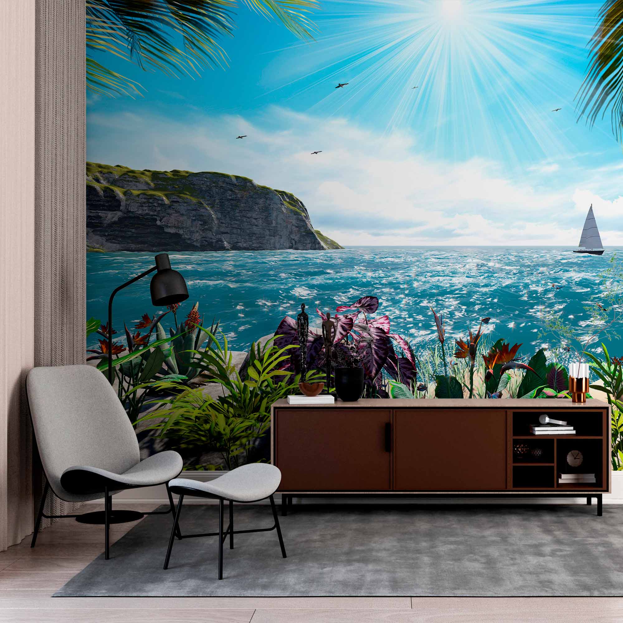 Słoneczny nadmorski raj z żaglówką Tapeta ścienna