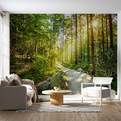 Tapeta fototapeta oświetlona leśną ścieżką - spokojny leśny szlak z promieniującym światłem słonecznym