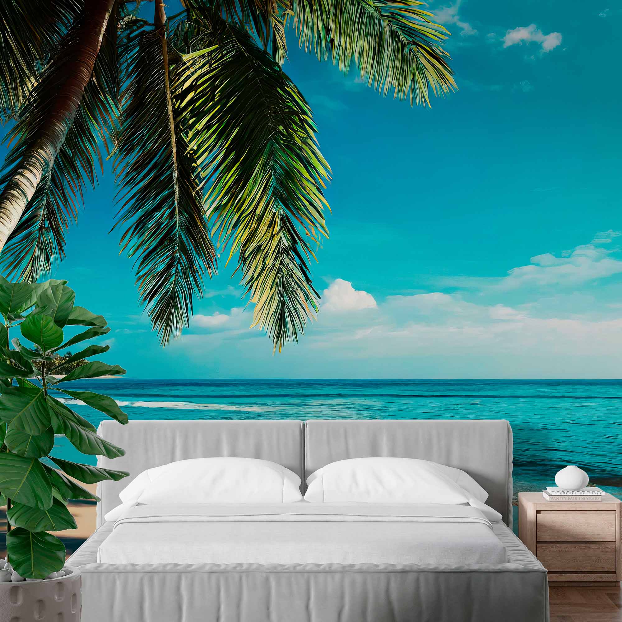Zdjęcie przedstawia spokojną tropikalną plażę z miękkim, złotym piaskiem i czystymi, błękitnymi falami oceanu delikatnie toczącymi się na brzeg. Wysokie palmy z bujnymi zielonymi liśćmi wiszą nad głowami, rzucając chłodne cienie na plażę. Jasne błękitne niebo z kilkoma rozproszonymi chmurami potęguje wrażenie idealnego, słonecznego dnia. Ta scena oddaje esencję spokojnego i idyllicznego wypoczynku w tropikach, dzięki czemu jest idealną tapetą wywołującą relaks i poczucie ucieczki