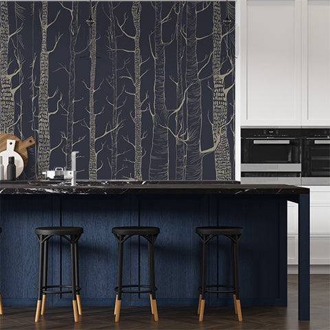 Sylwetka wysokich złotych drzew na ciemnoniebieskim tle Tapety ścienne