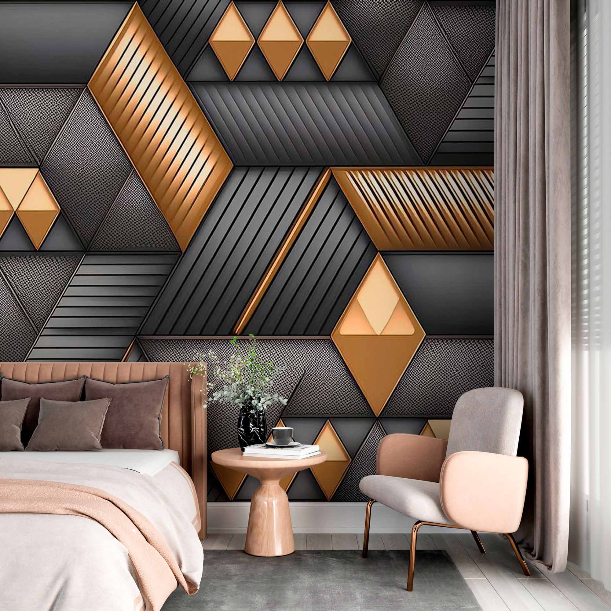 Zdjęcie przedstawia fototapetę z luksusowym geometrycznym wzorem łączącym metaliczne złoto i eleganckie odcienie czerni. Projekt zawiera różne trójwymiarowe kształty, w tym trójkąty, romby i paski, ułożone w abstrakcyjny wzór. Każdy kształt ma inną teksturę, tworząc głębię i zainteresowanie wizualne. Połączenie złotych akcentów i ciemnoszarych powierzchni nadaje fototapecie nowoczesny, wyrafinowany charakter, dzięki czemu idealnie nadaje się do dodania odważnego i eleganckiego akcentu do wnętrza.