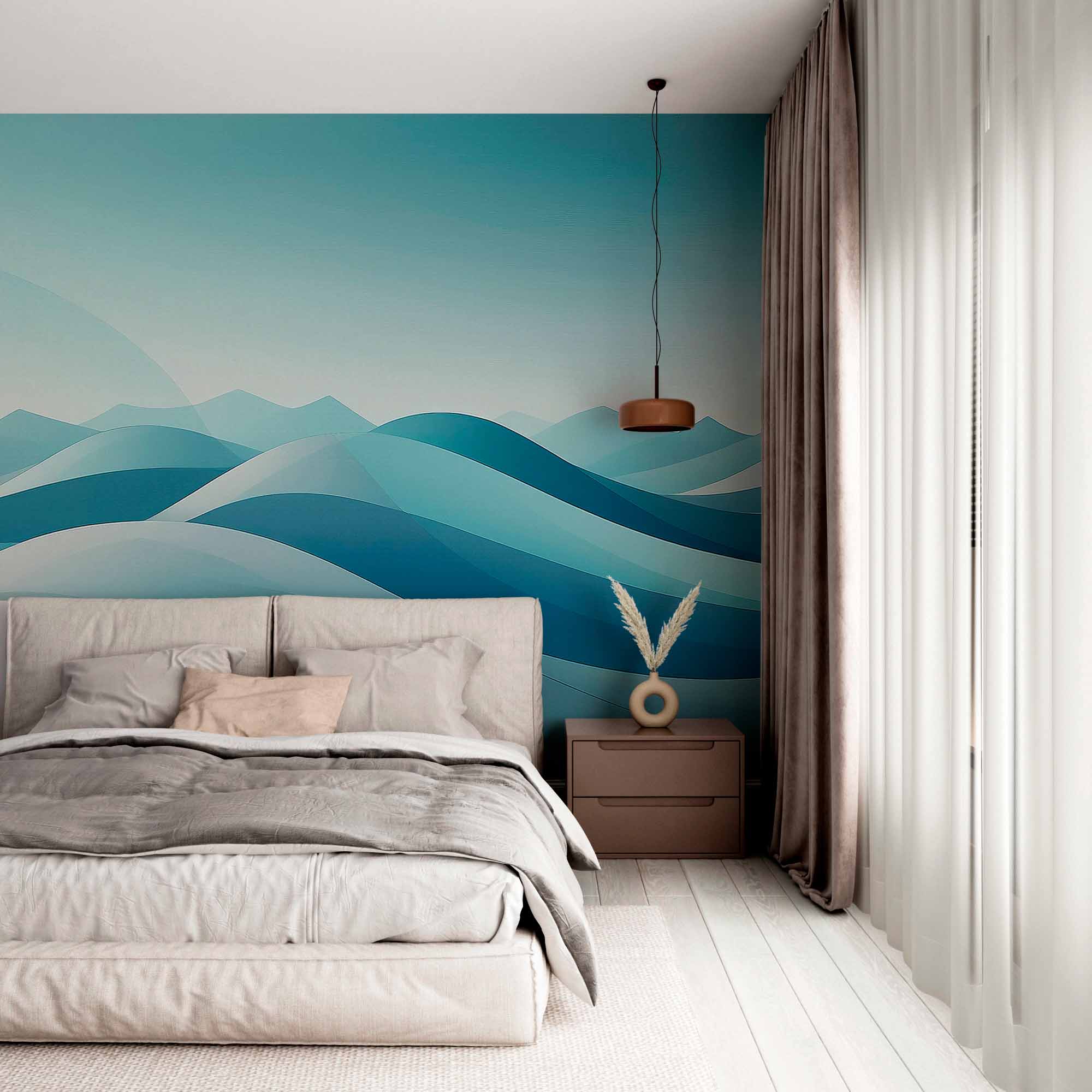 Obraz przedstawia spokojny, abstrakcyjny krajobraz z płynącymi, warstwowymi falami w odcieniach błękitu i turkusu. Fale tworzą wrażenie głębi i ruchu, przypominając pagórki lub delikatne fale morskie pod czystym, bladym niebem. Kompozycja jest minimalistyczna i kojąca, z gładkimi gradientami i miękkimi krzywiznami.