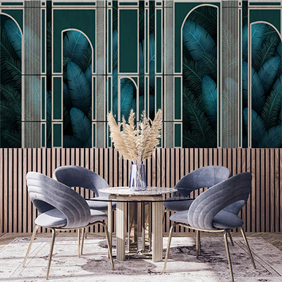Tropikalna fototapeta w stylu art deco - ciemnozielone liście z geometrycznymi złotymi i białymi liniami