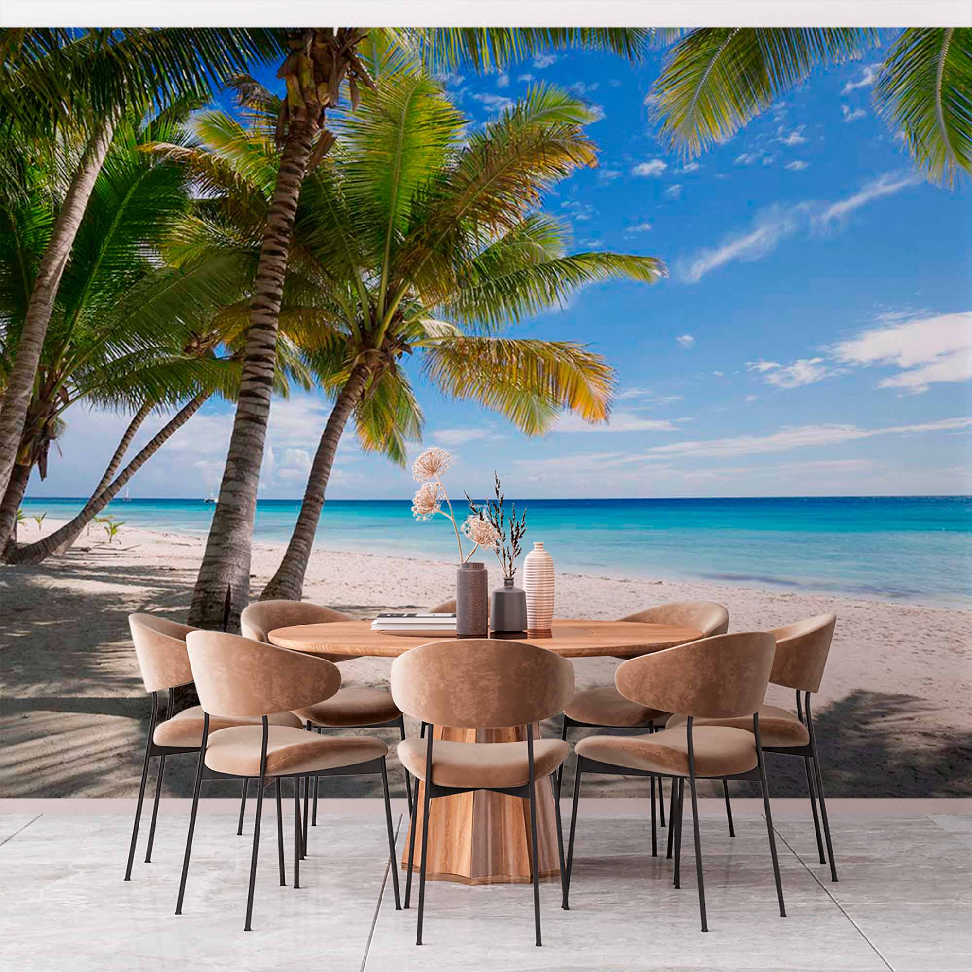 Tapeta na wymiar Tropikalna plaża z palmami i łodzią
