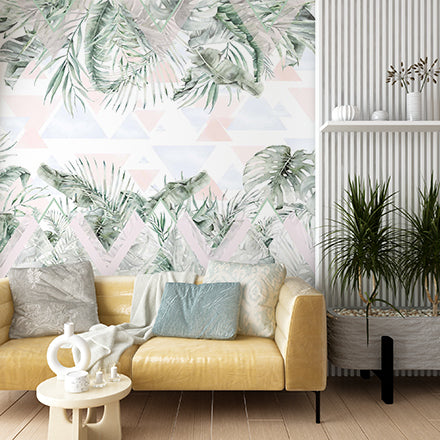 Tapeta fototapeta z tropikalnym liściem z geometrycznym tłem