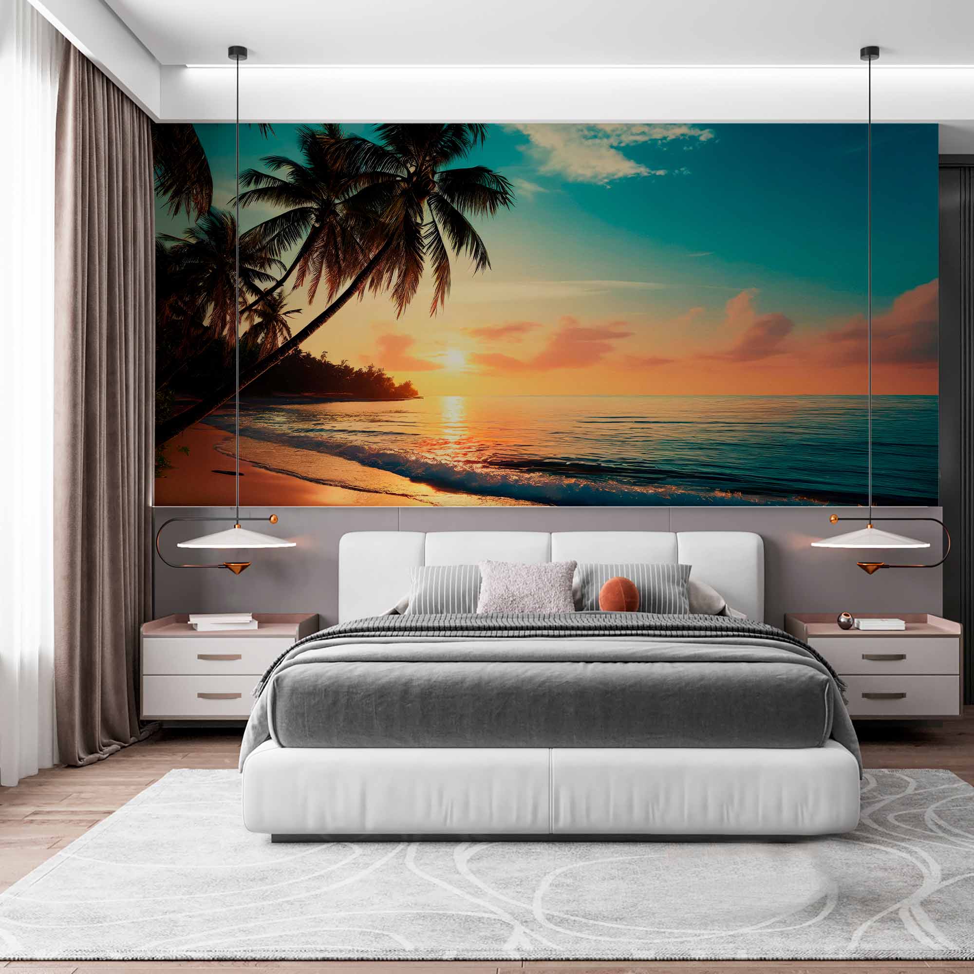 To urzekające zdjęcie przedstawia spokojną tropikalną plażę o zachodzie słońca. Niebo pomalowane jest na ciepłe odcienie pomarańczu i różu, stopniowo wtapiające się w chłodny błękit gasnącego światła dziennego. Wysokie palmy delikatnie kołyszą się na wietrze, rzucając długie cienie na piaszczysty brzeg. Spokojny ocean odzwierciedla żywe kolory nieba, a delikatne fale uderzają o plażę. Ta tapeta przywołuje poczucie spokoju i spokojnego piękna tropikalnego raju o zmierzchu.