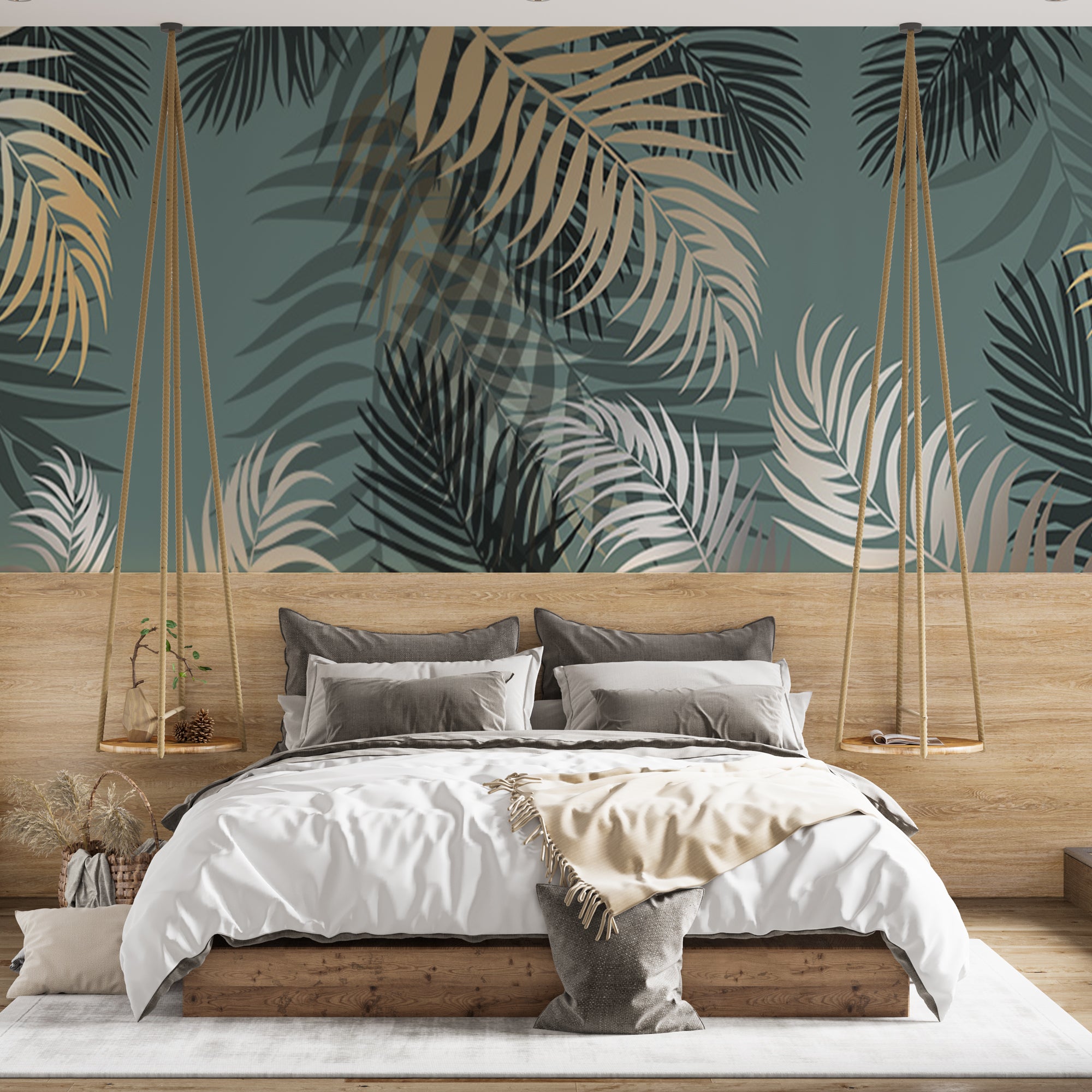 Bring a touch of tropical glamour to your home with this stunning gold palm leaf wallpaper. This design features a lush arrangement of stylized palm leaves in varying shades of green, accented with shimmering gold details that catch the light beautifully. The vibrant colors and intricate patterns create a sense of depth and dimension, adding a touch of exotic elegance to any space. This wallpaper is perfect for creating a statement wall in a living room, bedroom, or dining room, or for adding a touch of tropical flair to a bathroom or dressing room. Printed on high-quality, durable wallpaper material, this design is easy to install and maintain. Let this gold palm leaf wallpaper transport you to a luxurious tropical getaway.