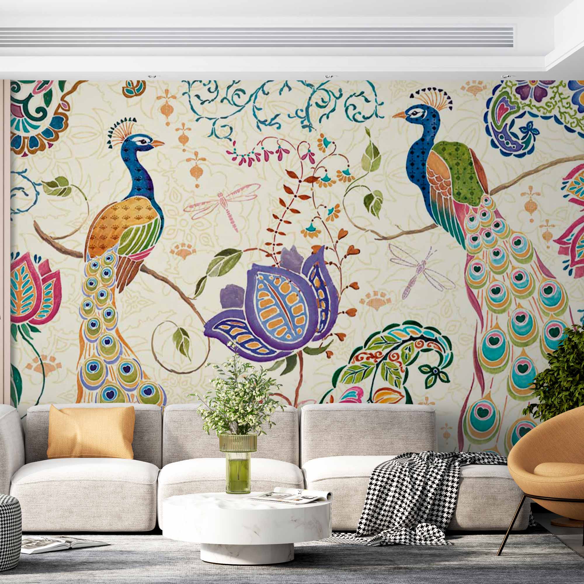 Naklejka ścienna Dwa pawie z motywem kwiatowym Orientalna tapeta