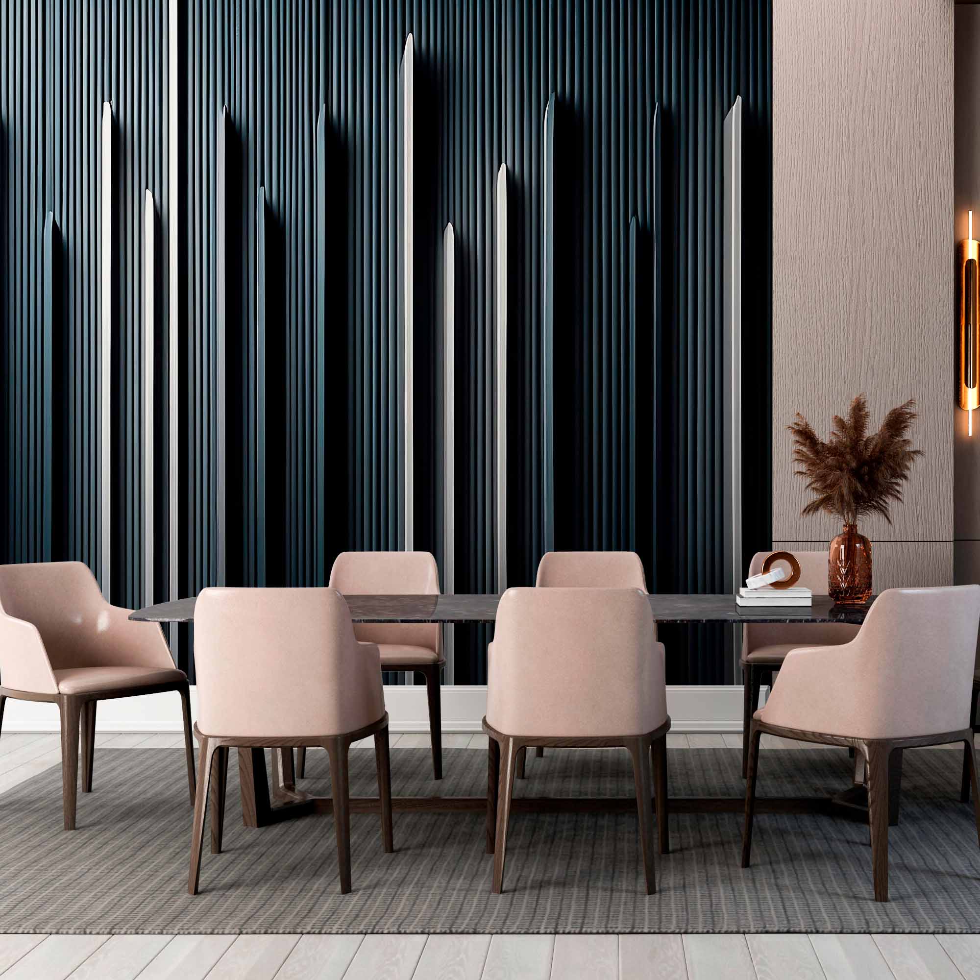 Obraz ma elegancki, nowoczesny, abstrakcyjny wzór z pionowymi, metalicznymi liniami na ciemnym tle. Linie różnią się grubością i wysokością, tworząc dynamiczny i trójwymiarowy efekt. Gra światła i cienia wzmacnia metaliczny połysk, nadając kompozycji wyrafinowany i nowoczesny wygląd. Ogólna estetyka jest minimalistyczna, z naciskiem na czyste linie i geometryczną precyzję.