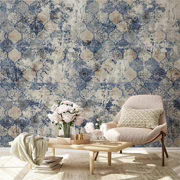 Tapeta w stylu vintage w trudnej sytuacji, niebiesko-biała z kwiatowymi kafelkami