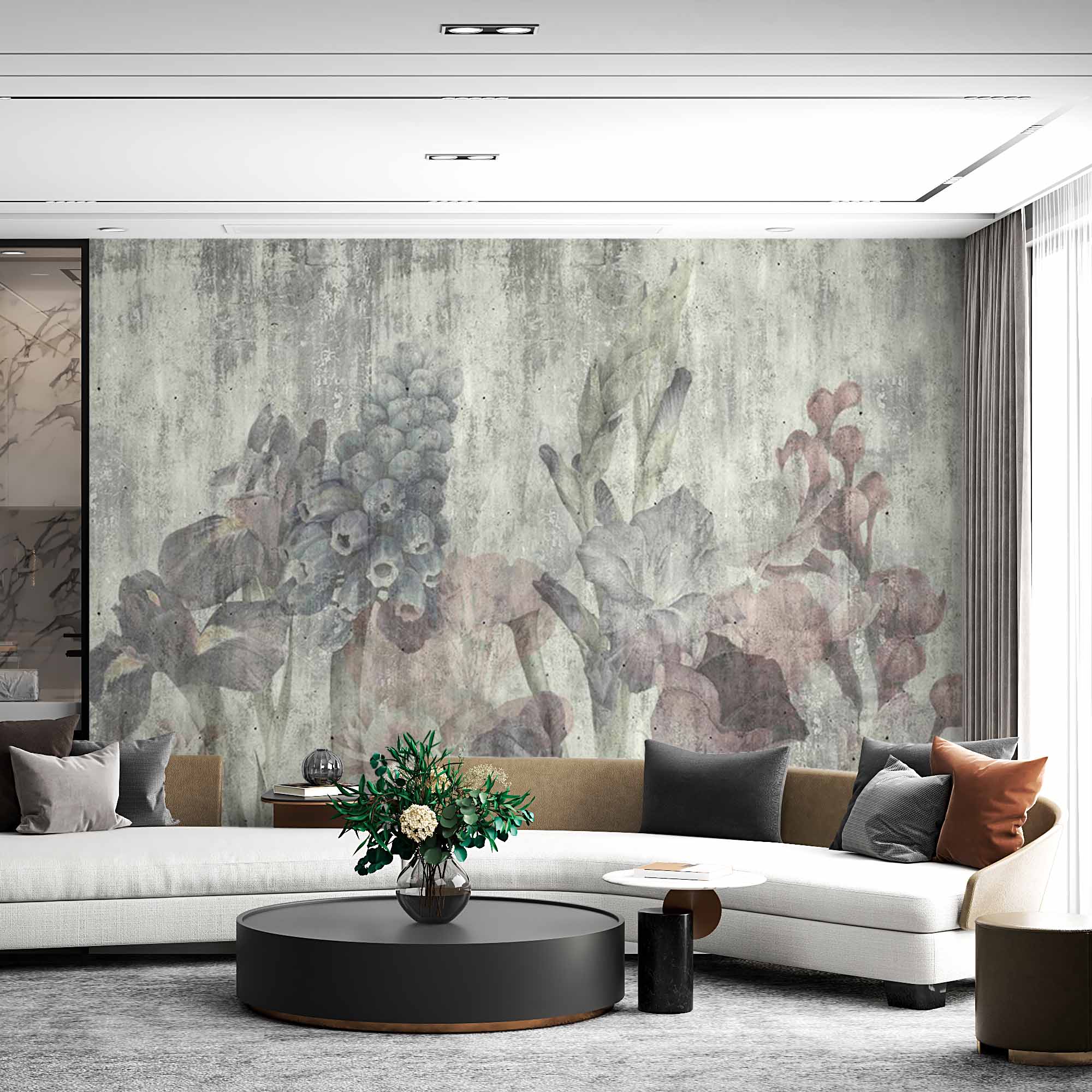 Ta fototapeta przedstawia stonowaną kompozycję kwiatową w stylu vintage na teksturowanym, wyblakłym tle. Miękkie, wyblakłe odcienie kwiatów, w tym irysów i naparstnicy, nadają fototapecie antyczny, rustykalny charakter. Znoszona faktura dodaje głębi i charakteru, dzięki czemu idealnie nadaje się do tworzenia estetyki vintage lub industrialnej z odrobiną botanicznej elegancji.