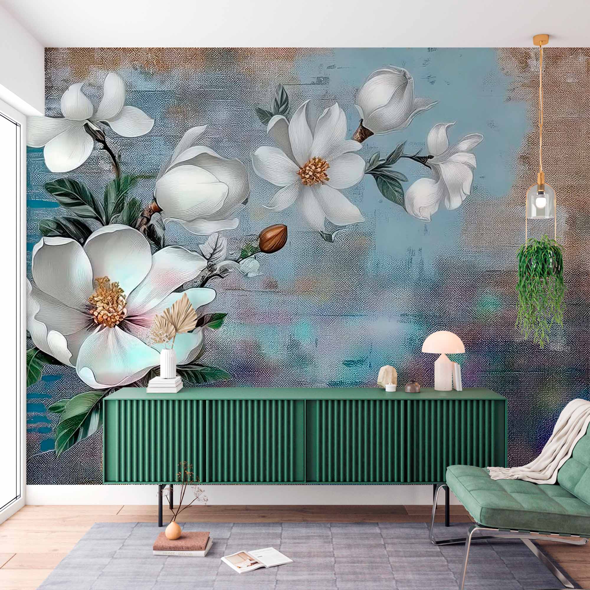 Ta tapeta przedstawia oszałamiającą kompozycję kwiatów magnolii na teksturowanym, abstrakcyjnym tle. Magnolie są pięknie odwzorowane w delikatnych, kremowo-białych odcieniach z delikatnym cieniowaniem, które dodaje głębi i realizmu każdemu płatkowi. Kwiaty podkreślają bujne zielone liście, a kompozycja jest pełna wdzięku i elegancji. Tło to mieszanka stonowanych błękitów, szarości i subtelnych odcieni ziemi, z lekko postarzaną fakturą, która nadaje projektowi ponadczasowy charakter vintage. Współgranie światła i koloru w tle dodaje nuty nowoczesnego kunsztu, dzięki czemu ta tapeta idealnie nadaje się do tworzenia przestrzeni zarówno klasycznej, jak i współczesnej.