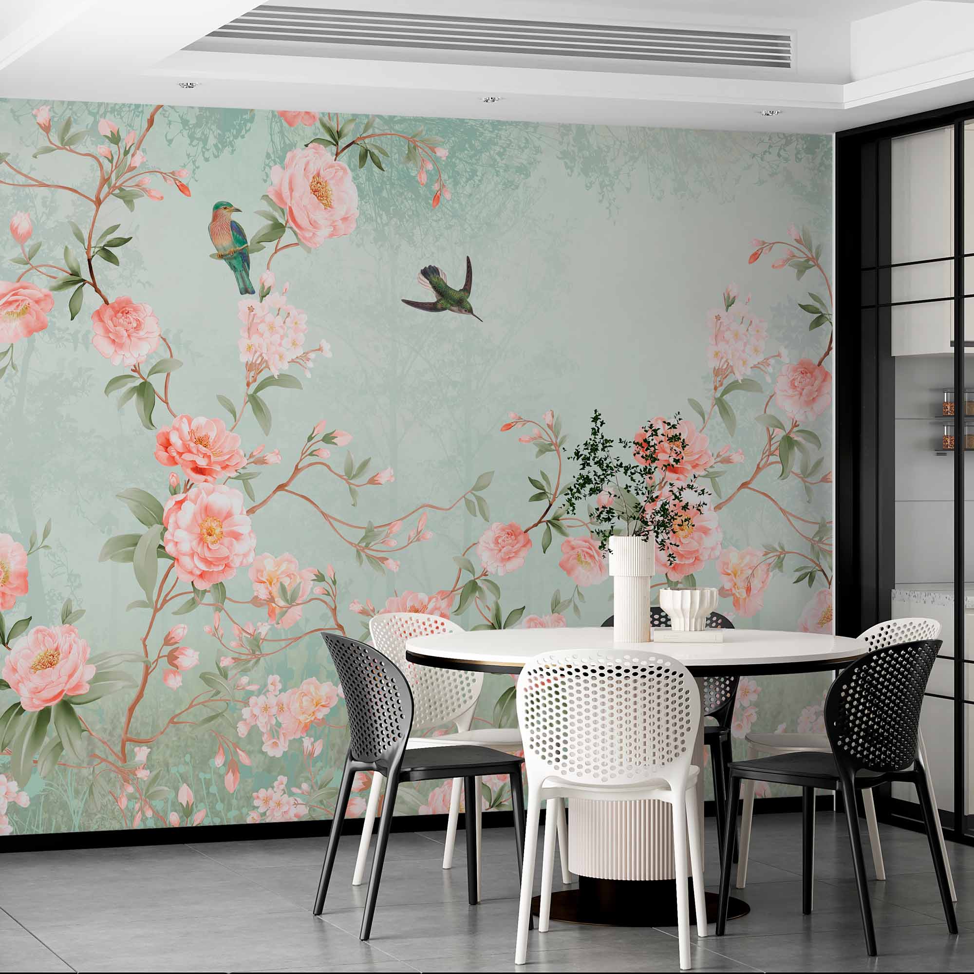 Vintage pastelowa tapeta z motywem kwiatowym i ptakiem