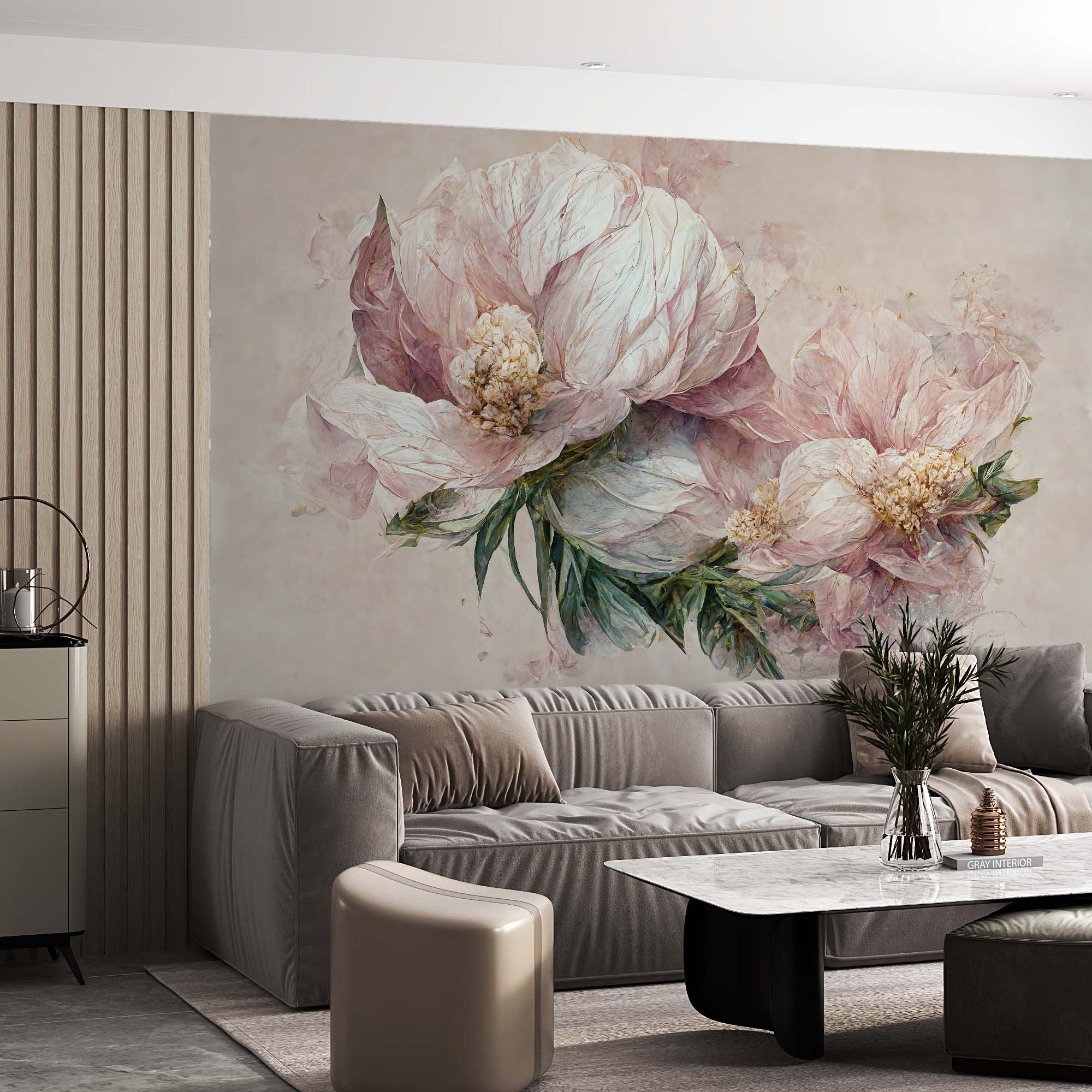 To zdjęcie przedstawia teksturowaną tapetę w stylu vintage, przedstawiającą duże, delikatnie zabarwione piwonie w odcieniach jasnoróżowego i kremowego. Kwiaty sprawiają wrażenie niemal malarskich, z misternymi detalami i lekko zniszczonym efektem postarzania, który dodaje kompozycji głębi i charakteru. Tło stanowi stonowany beż, co dodatkowo podkreśla antyczny i elegancki charakter projektu, czyniąc go idealnym wyborem do stworzenia wyrafinowanej i ponadczasowej atmosfery.
