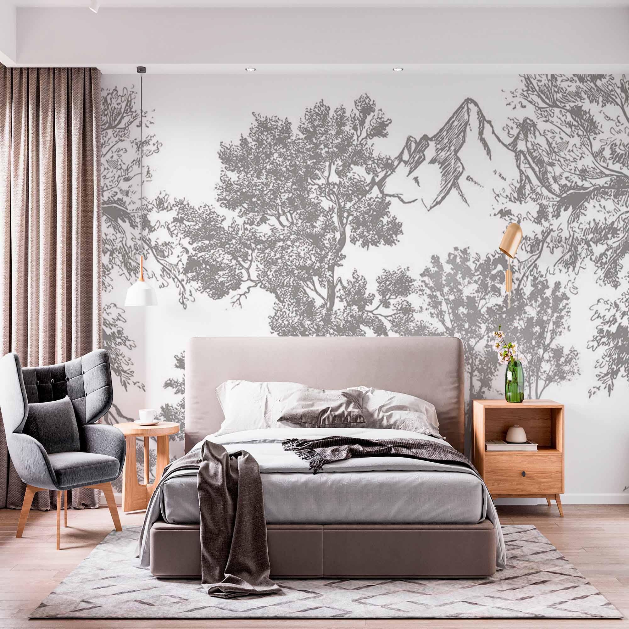 Vintage szkic krajobraz fototapeta tapeta-drzewa i góry w skali szarości