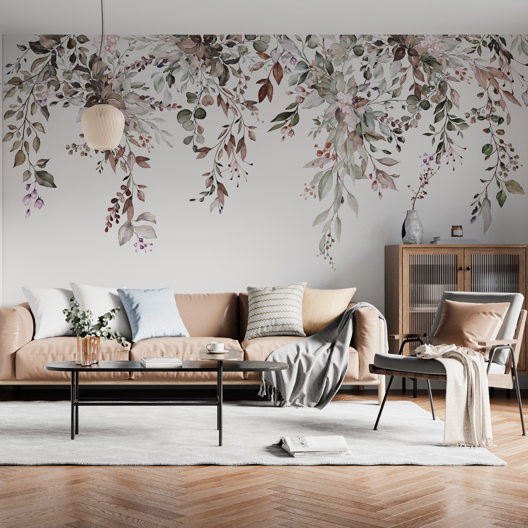 Ta fototapeta przedstawia piękną aranżację kaskadowych liści i kwiatów w delikatnych, ziemistych odcieniach brązu, zieleni i różu. Delikatne gałązki ozdobione jagodami i liśćmi tworzą naturalny, płynny wzór. Stonowana, inspirowana jesienią paleta wywołuje poczucie ciepła i przytulności, idealne do stworzenia spokojnej i zachęcającej atmosfery.