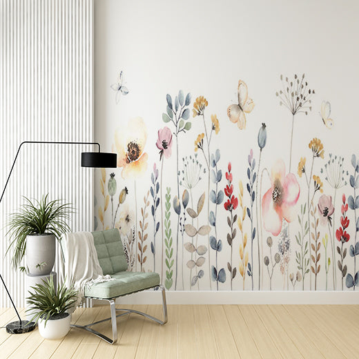 Akwarela kwiatowa tapeta ścienna - delikatny wzór polnych kwiatów i motyli