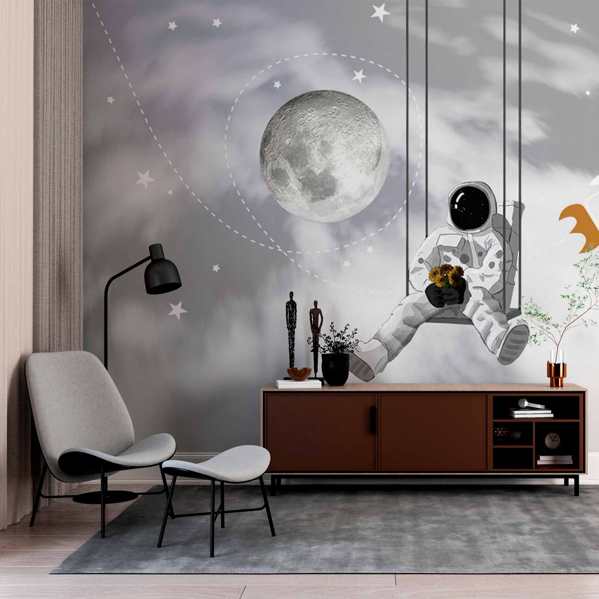Fantastyczna fototapeta astronauta - kołyszący się w kosmosie z księżycem i rakietami