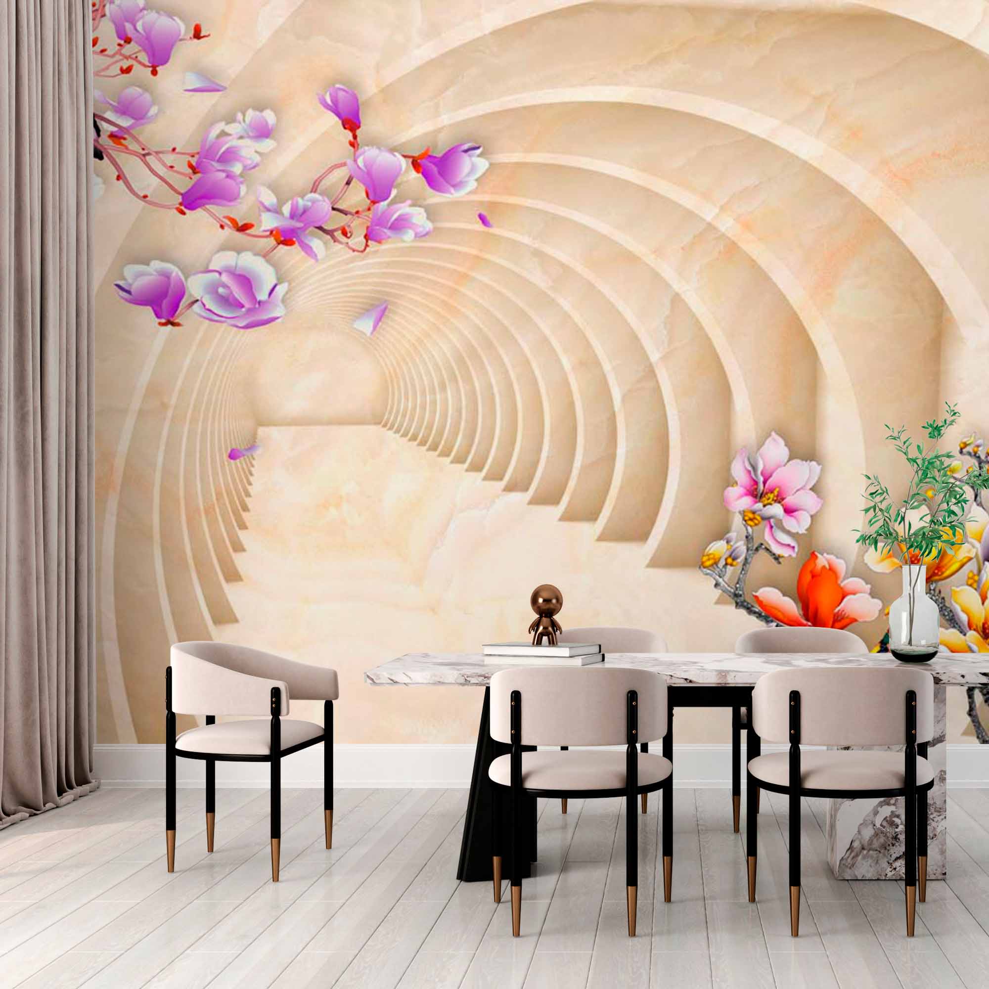 To zdjęcie przedstawia piękny wzór tapety z łukiem przypominającym tunel, który stopniowo zanika w oddali, tworząc wrażenie głębi i nieskończoności. Łuki otoczone są delikatnymi, kolorowymi kwiatami w odcieniach fioletu, różu, żółci i bieli. Ptaki siedzą na gałęziach, dodając scenie naturalny i spokojny element. Miękkie, ciepłe odcienie tła podkreślają spokojną atmosferę, dzięki czemu ten projekt idealnie nadaje się do stworzenia spokojnej i marzycielskiej przestrzeni.