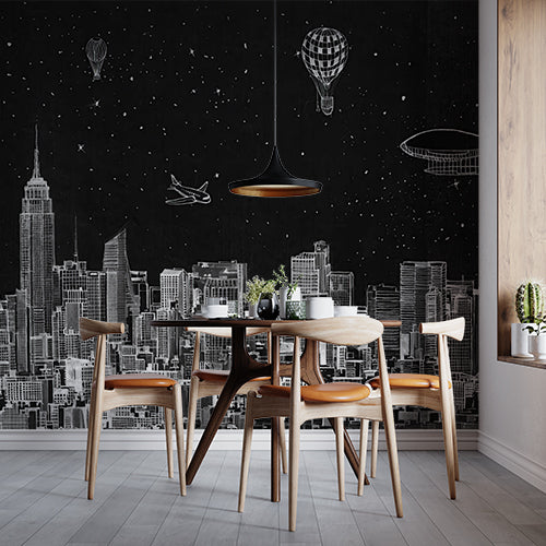 Fantazyjna fototapeta nocna panorama - czarno-biały pejzaż miejski z pływającymi balonami i sterowcami
