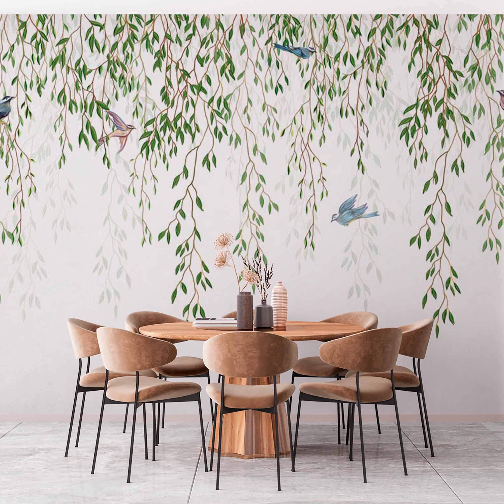 Ten wzór tapety przedstawia delikatne gałązki wierzby opadające kaskadą z miękkimi, zielonymi liśćmi. Pomiędzy gałęziami porozrzucane są małe, kolorowe ptaki, które tworzą spokojną i pogodną atmosferę. Tło jest jasne, przewiewne i białe, dzięki czemu naturalne elementy wyróżniają się w delikatny, fantazyjny sposób.