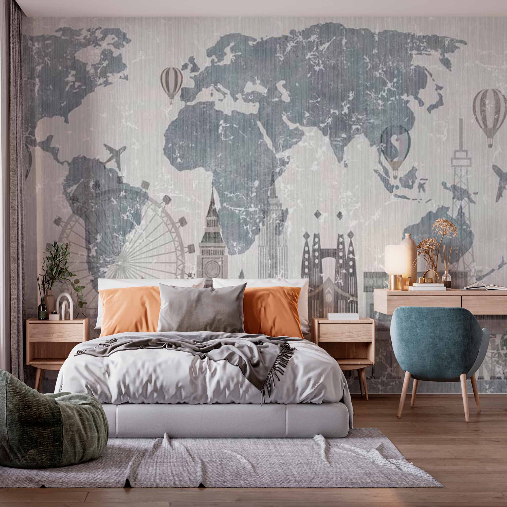 Fantastyczna fototapeta z mapą świata ze słynnymi zabytkami i motywem podróży w stylu vintage