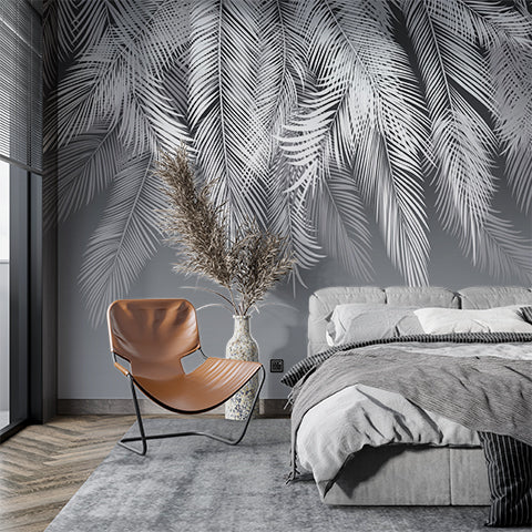 Tapeta z białymi piórami i ciemnym gradientem Monochromatyczna fototapeta z tropikalnym liściem palmowym