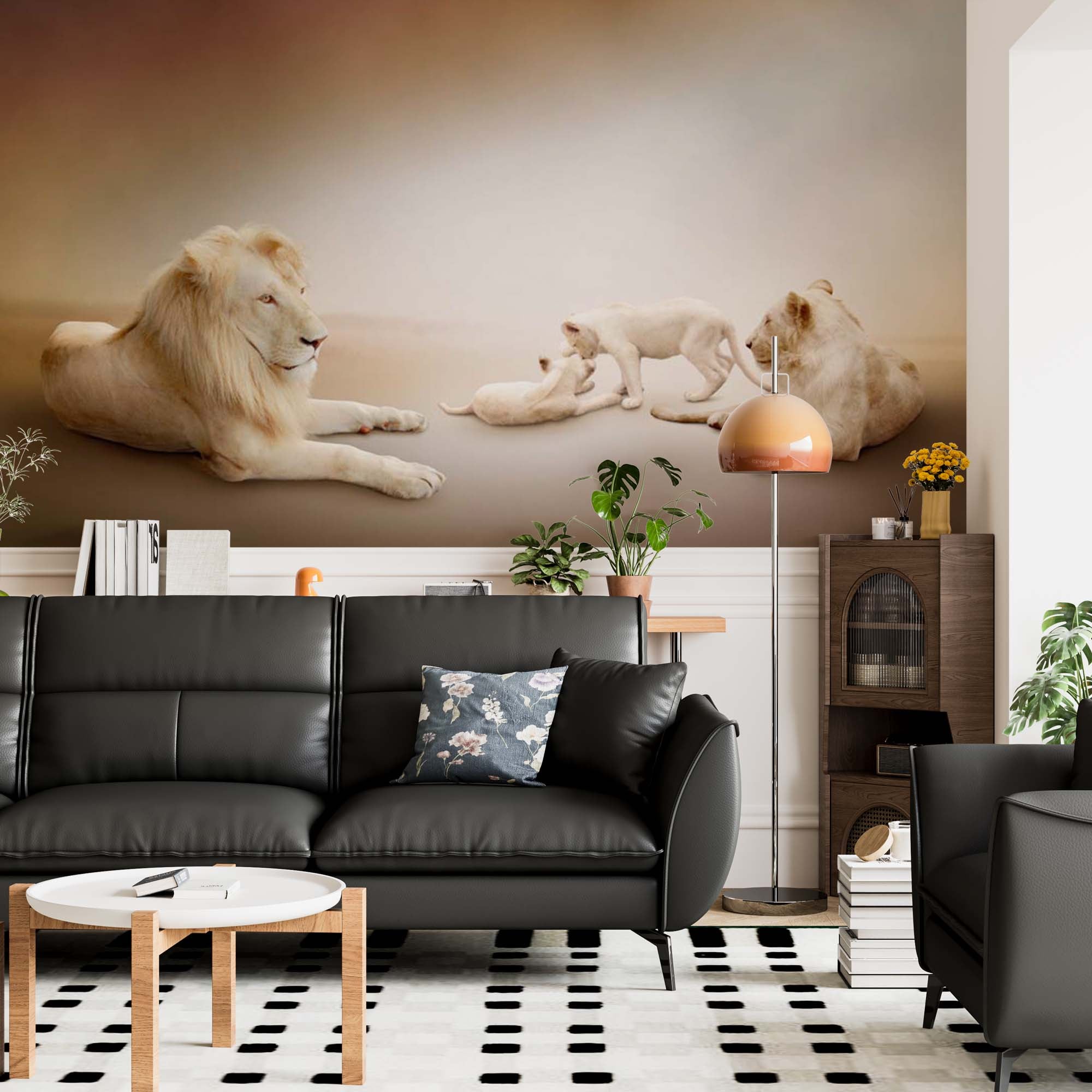 Tapeta ze zwierzętami w kolorze białym z motywem beżowych lwów