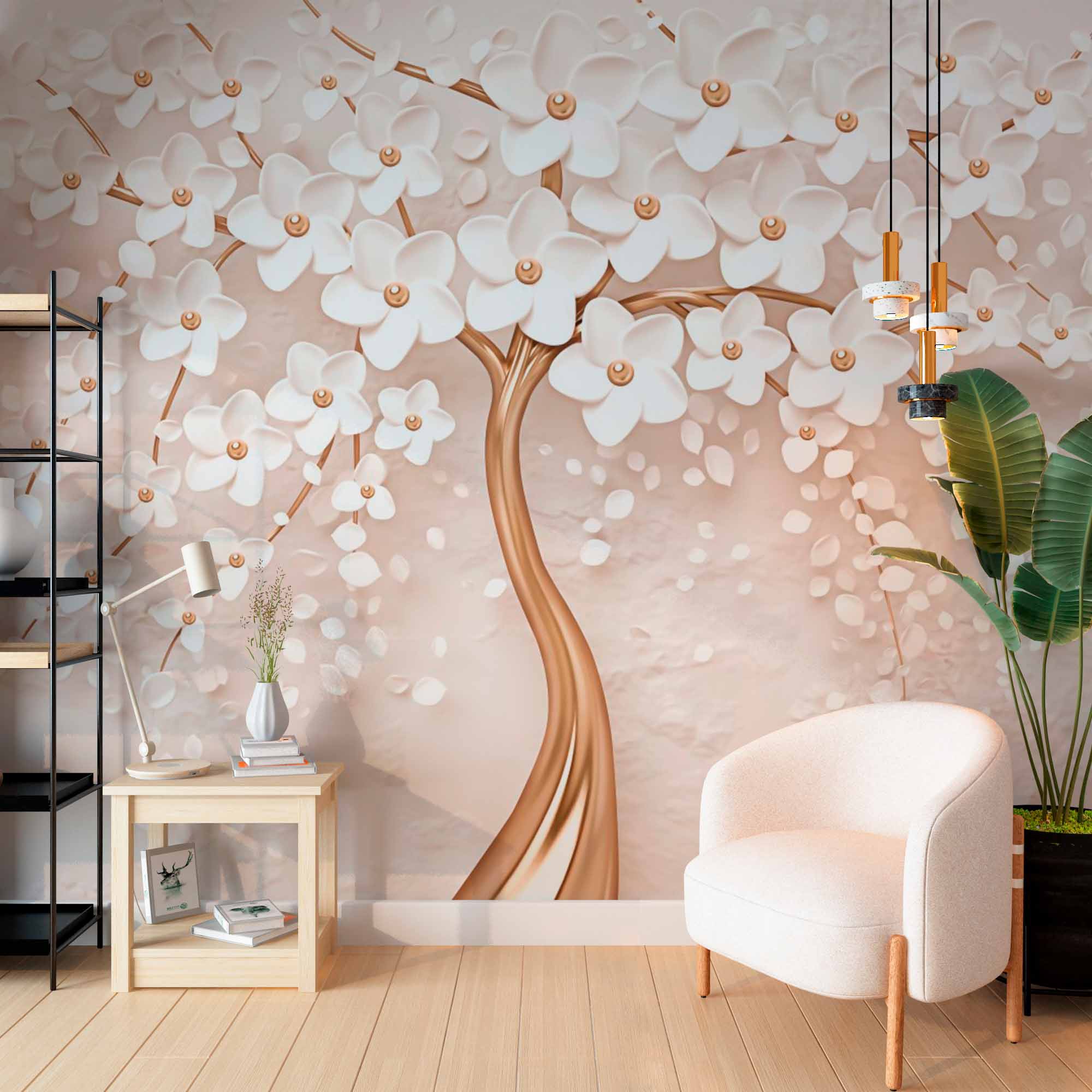 Ten obraz przedstawia pięknie zaprojektowaną tapetę przedstawiającą stylizowane drzewo ze złotymi gałęziami ozdobionymi delikatnymi białymi kwiatami. Kwiaty mają rzeźbiarski, trójwymiarowy wygląd, nadając projektowi wyrafinowany i luksusowy charakter. Tło stanowi miękki, teksturowany beż, który uzupełnia ciepłe odcienie złota, tworząc spokojną i elegancką atmosferę. Ogólny efekt to wyrafinowane piękno, co czyni go idealnym wyborem do wysokiej klasy, artystycznej aranżacji wnętrz.