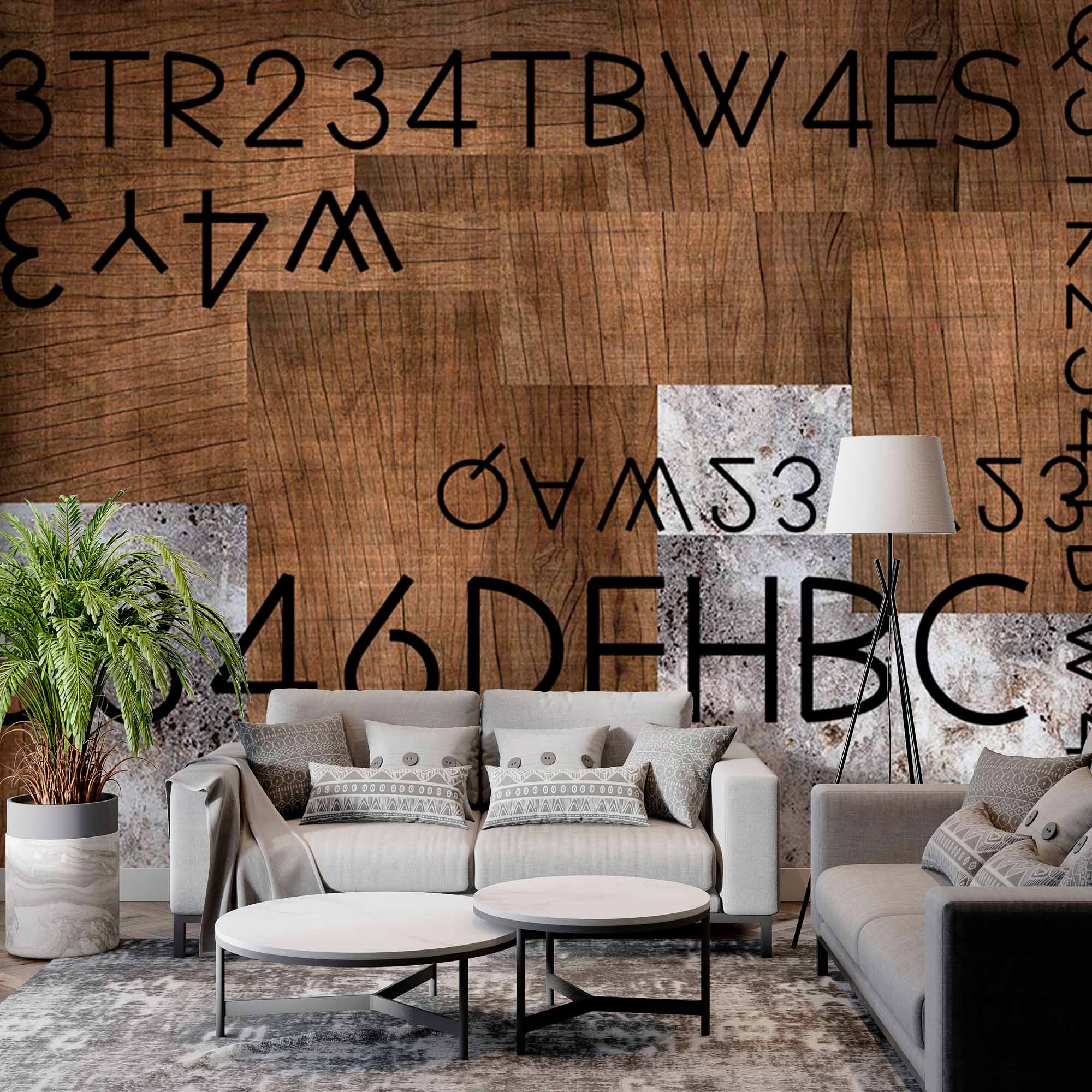Drewniana fototapeta z kolażem alfabetu i cyfr