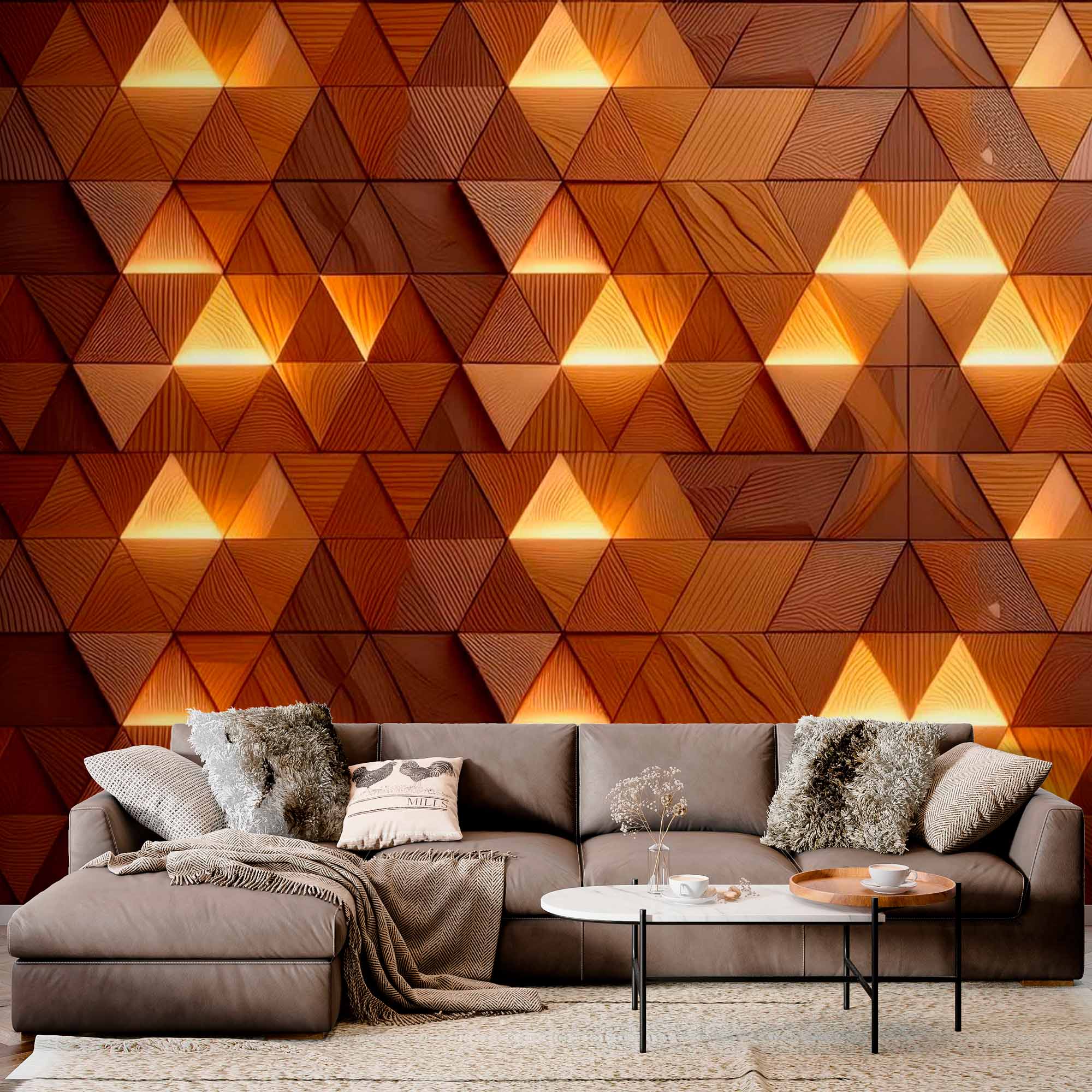 Na zdjęciu fototapeta z efektownym geometrycznym wzorem wykonanym z drewnianych trójkątów. Projekt ma trójwymiarową teksturę, a niektóre trójkąty są podświetlone od wewnątrz, tworząc ciepły, świecący efekt. Połączenie naturalnych faktur drewna i światła nadaje fototapecie bogaty, ziemisty charakter, zachowując jednocześnie nowoczesną i dynamiczną estetykę. Ta fototapeta byłaby idealna do dodania przytulnego, a jednocześnie współczesnego akcentu do przestrzeni wewnętrznej.