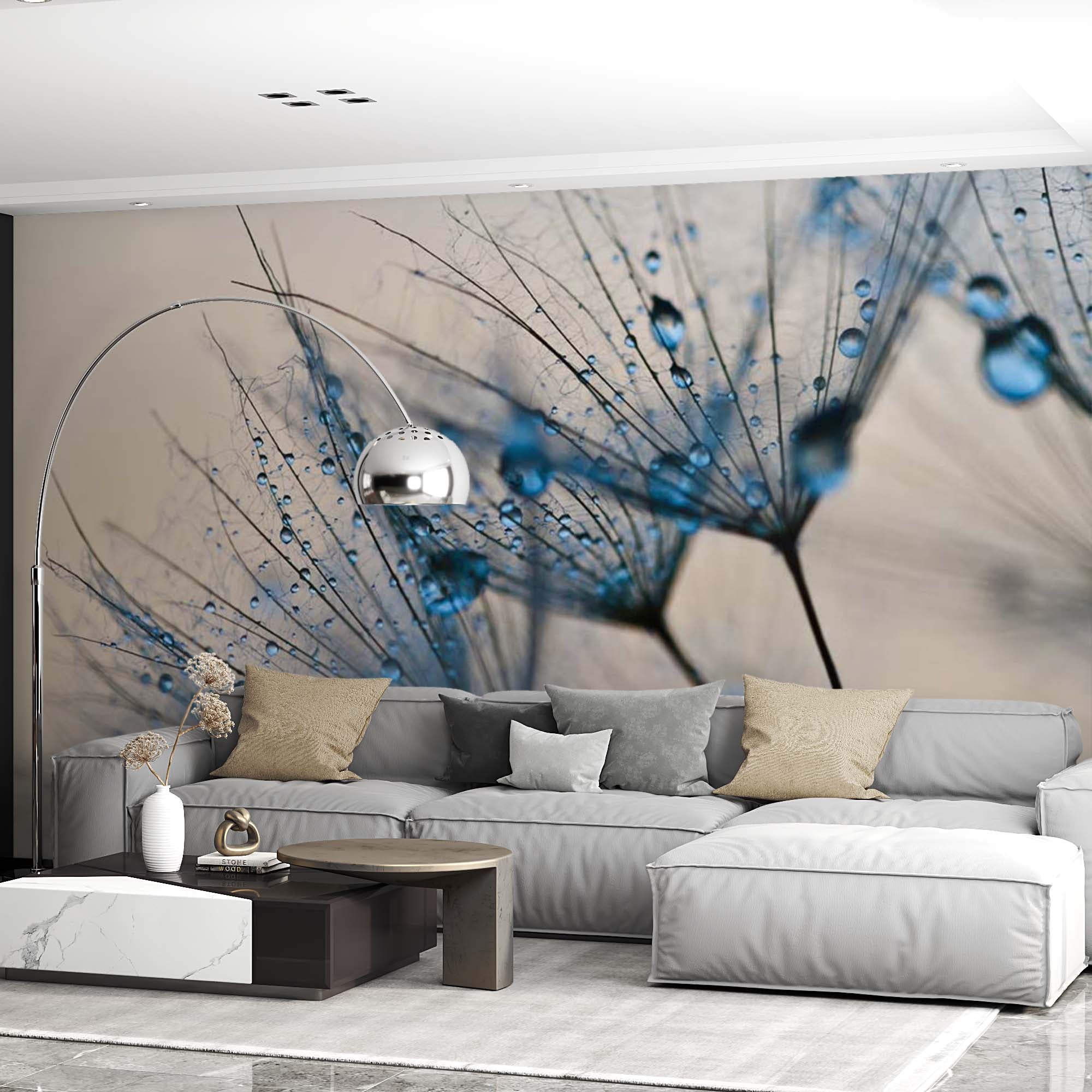 This wallpaper features a close-up of dandelion seeds covered in water droplets. The delicate details and soft, muted colors create a serene and calming atmosphere. The image evokes a sense of fragility and the beauty of nature, making it perfect for adding a touch of tranquillity to any space.