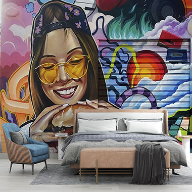 Colorful Urban Street Art Mural - Girl with Burger in Graffiti Style Wall Mural Wallpaper