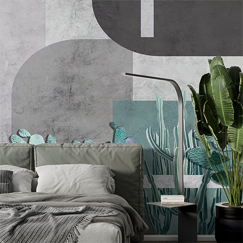 Contemporary Geometric Cactus Wall Mural Wallpaper with Concrete Texture