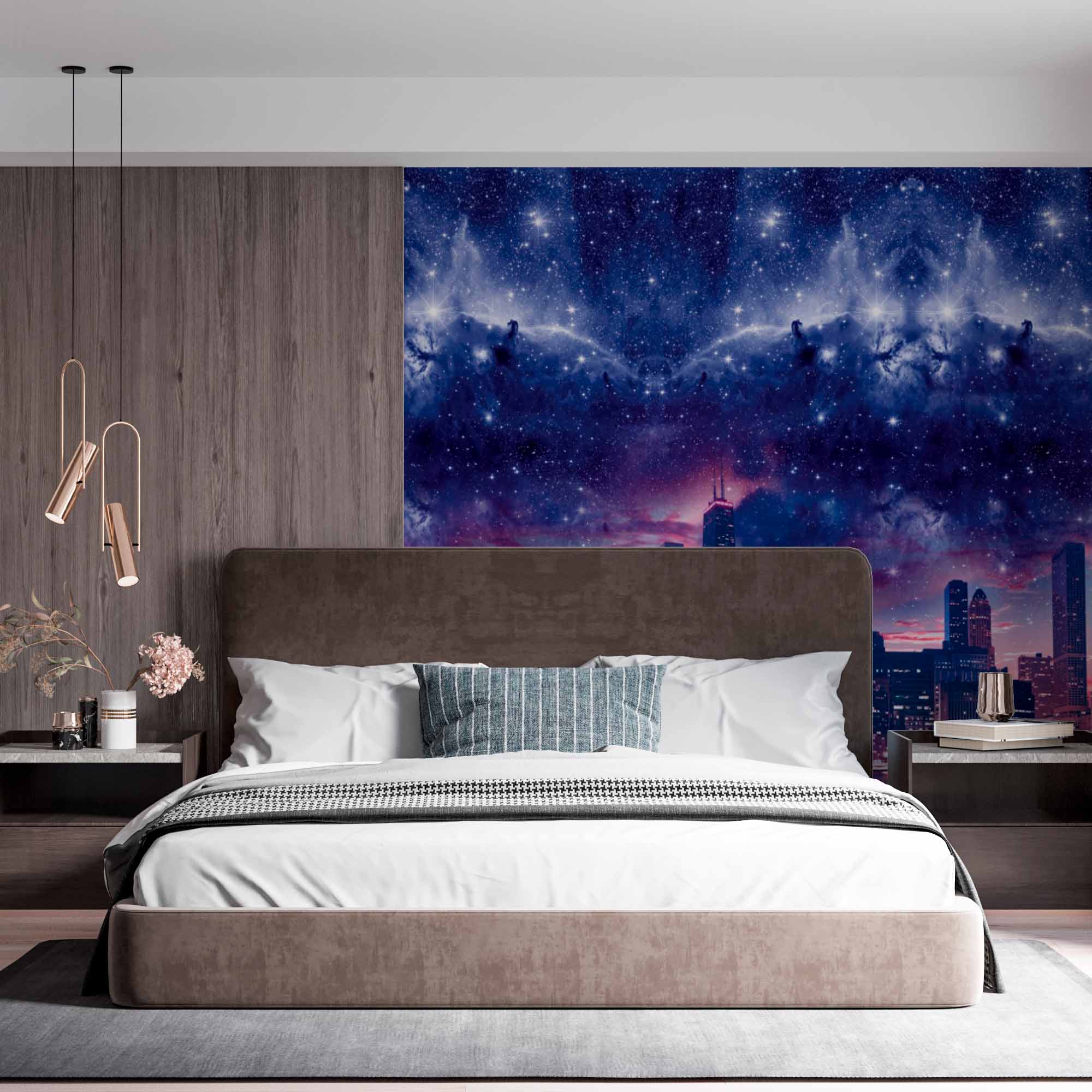 Cosmic Cityscape Wall Mural Wallpaper - Night Skyline Blended with Starry Galaxy