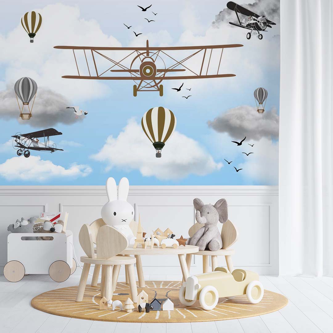 Custom Kids Wall Mural Vintage Airplane Sky Hot Air Ballons Wallpaper for Kids