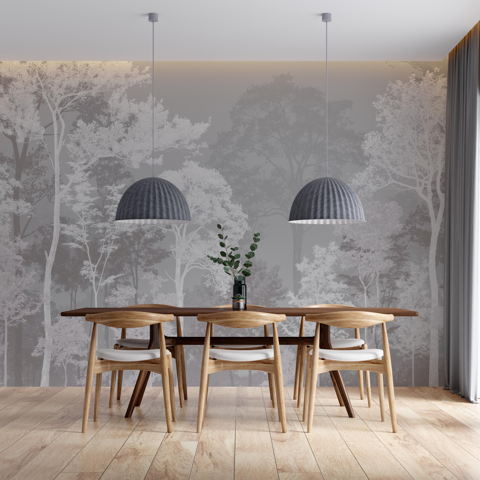 This elegant wallpaper features a stylized depiction of a forest scene in varying shades of gray and white. The misty, atmospheric design creates a sense of depth and tranquility, bringing the beauty of nature indoors. Perfect for living rooms, bedrooms, or as a feature wall to create a calming and relaxing ambiance. High-quality print ensures lasting beauty and detail.