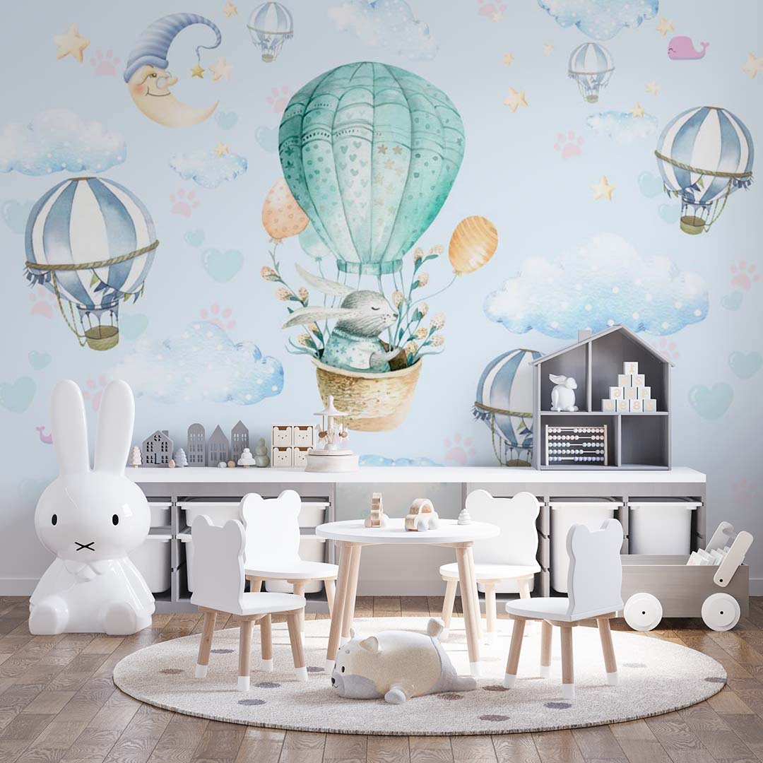 Kids Wall Mural Blue Sky Stars Turquoise Green Hot Air Balloons Wallpaper for Kids