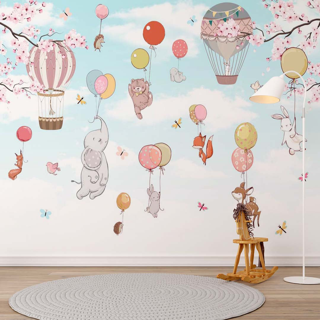 Kids Wall Mural Cartoon Animals Hot Air Balloons Woodland Nursery Wallpaper