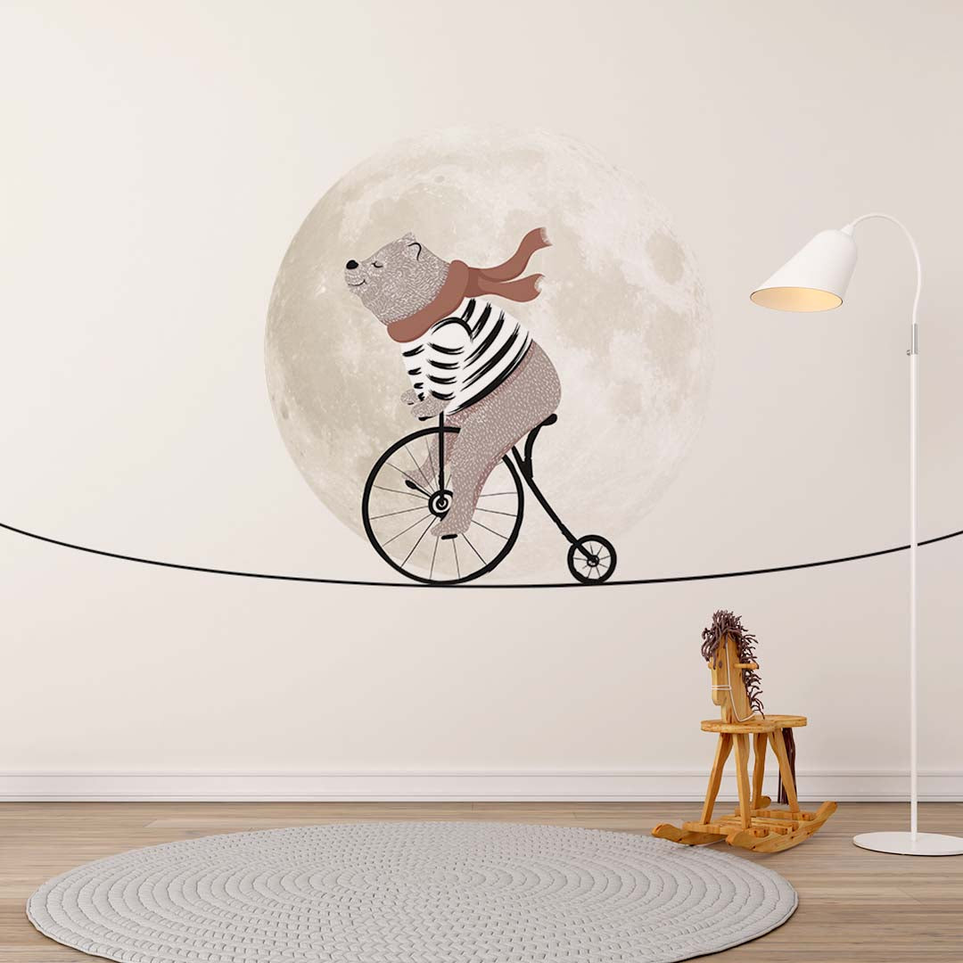 Kids Wall Mural Circus Bear on Bike Moon Sky Light Clouds Minimal Design Nursery Wallpaper