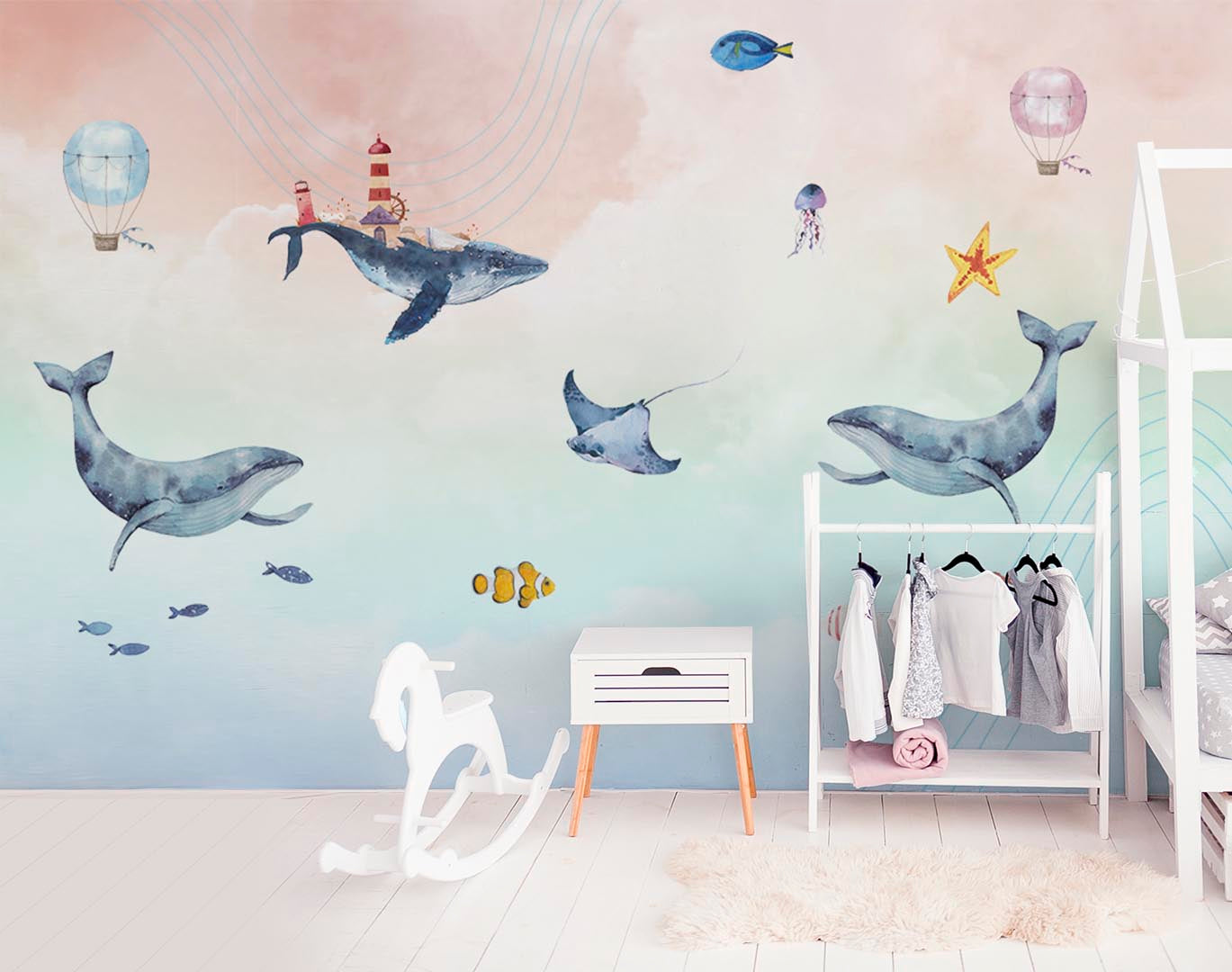 Kids Wall Mural Fairy Whale in Clouds Sky Ocean Minimal Design Nursery Wallpaper