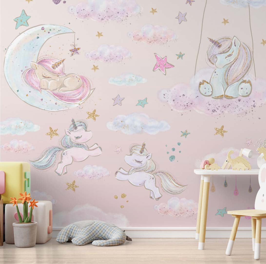 Kids Wall Mural Fairytale Unicorns Pony and Stars Pink Girl Nursery Wallpaper