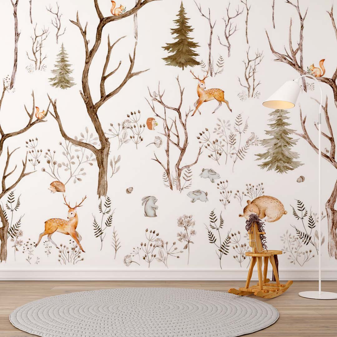 Kids Wall Mural Minimal Design Woodland Animals Scandinavian Wallpaper for Kids Room