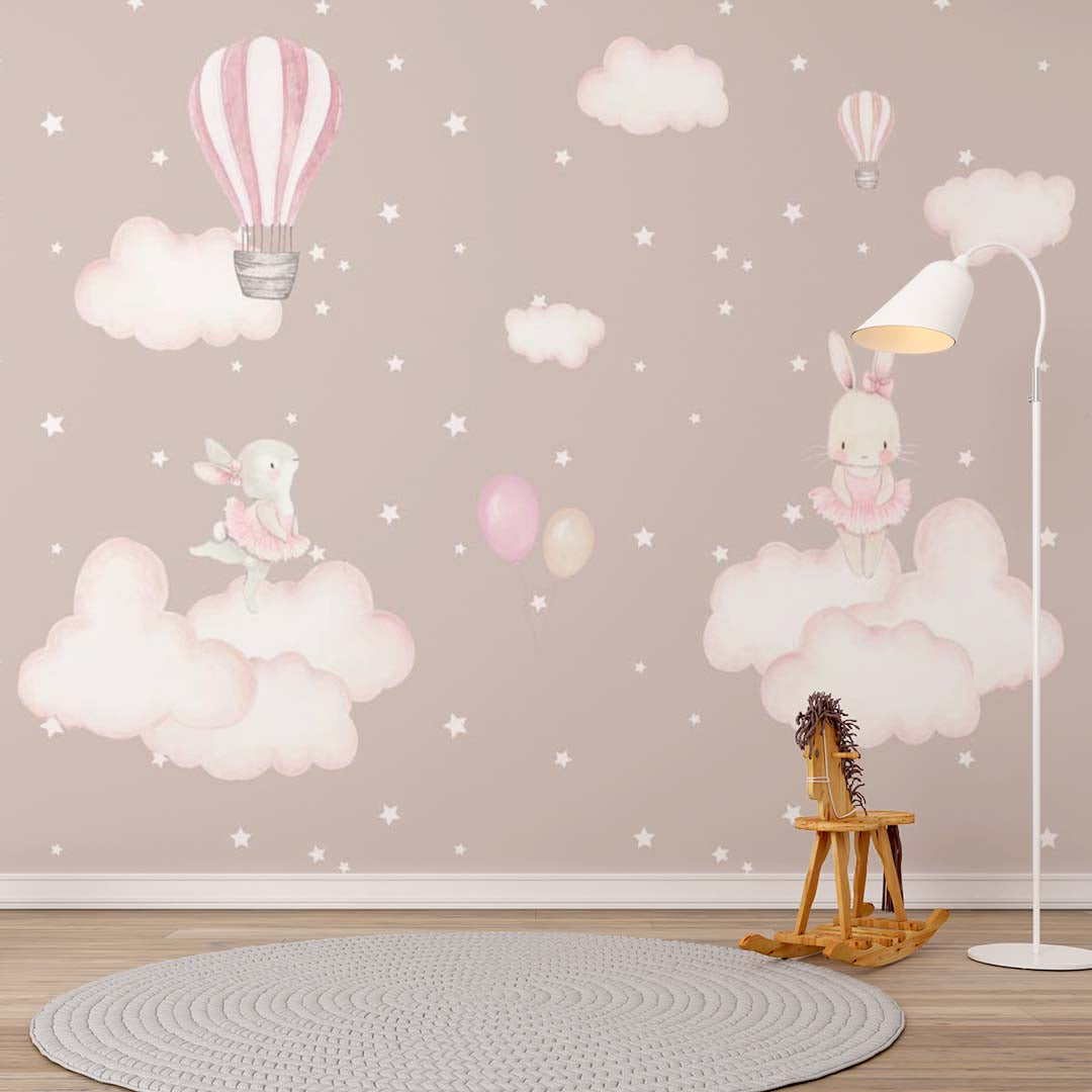 Kids Wall Mural Pink Clouds Hot Air Balloons Cute Rabbits Nursery Wallpaper