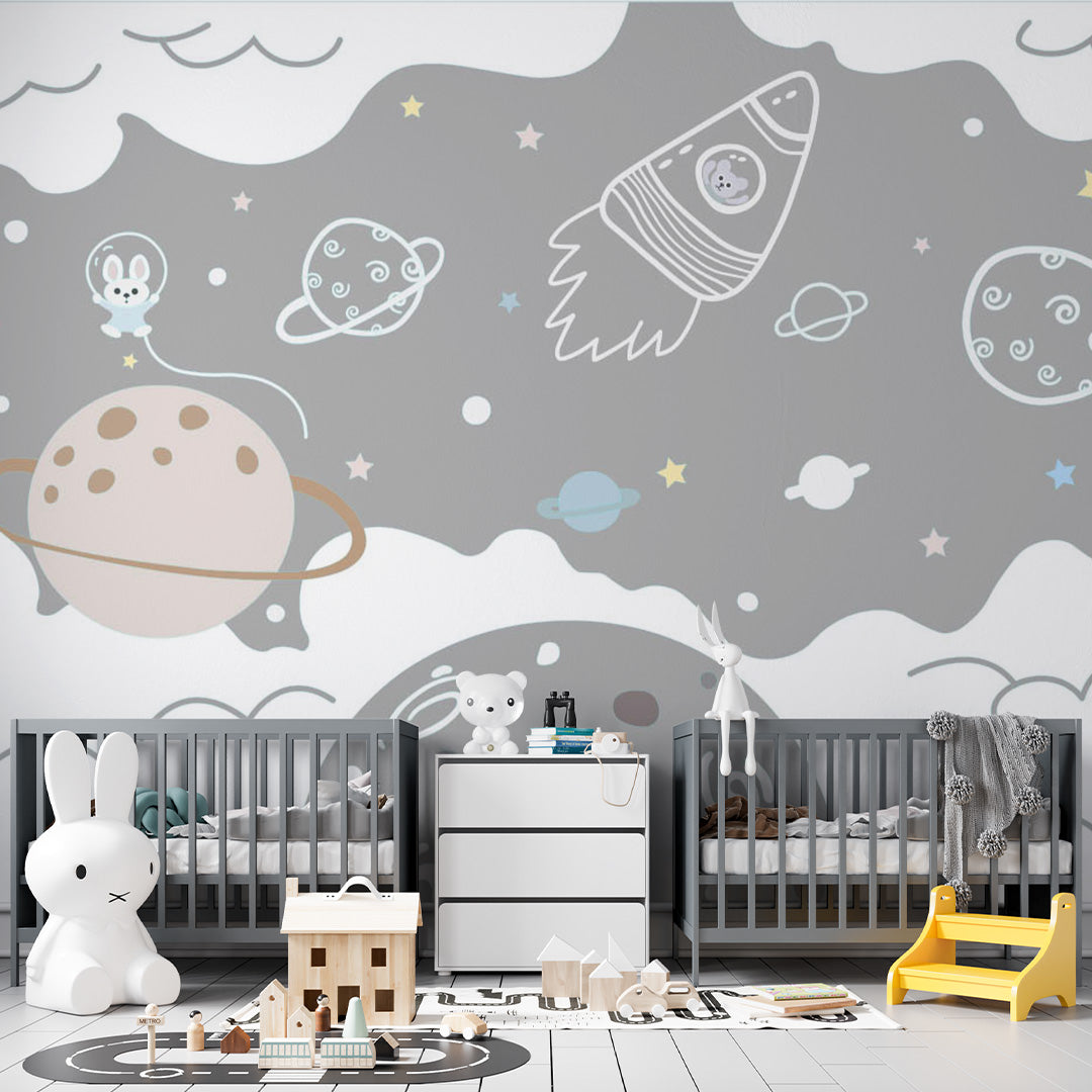Kids Wall Murals Cartoon Animals Space Rocket Wallpaper for Kids